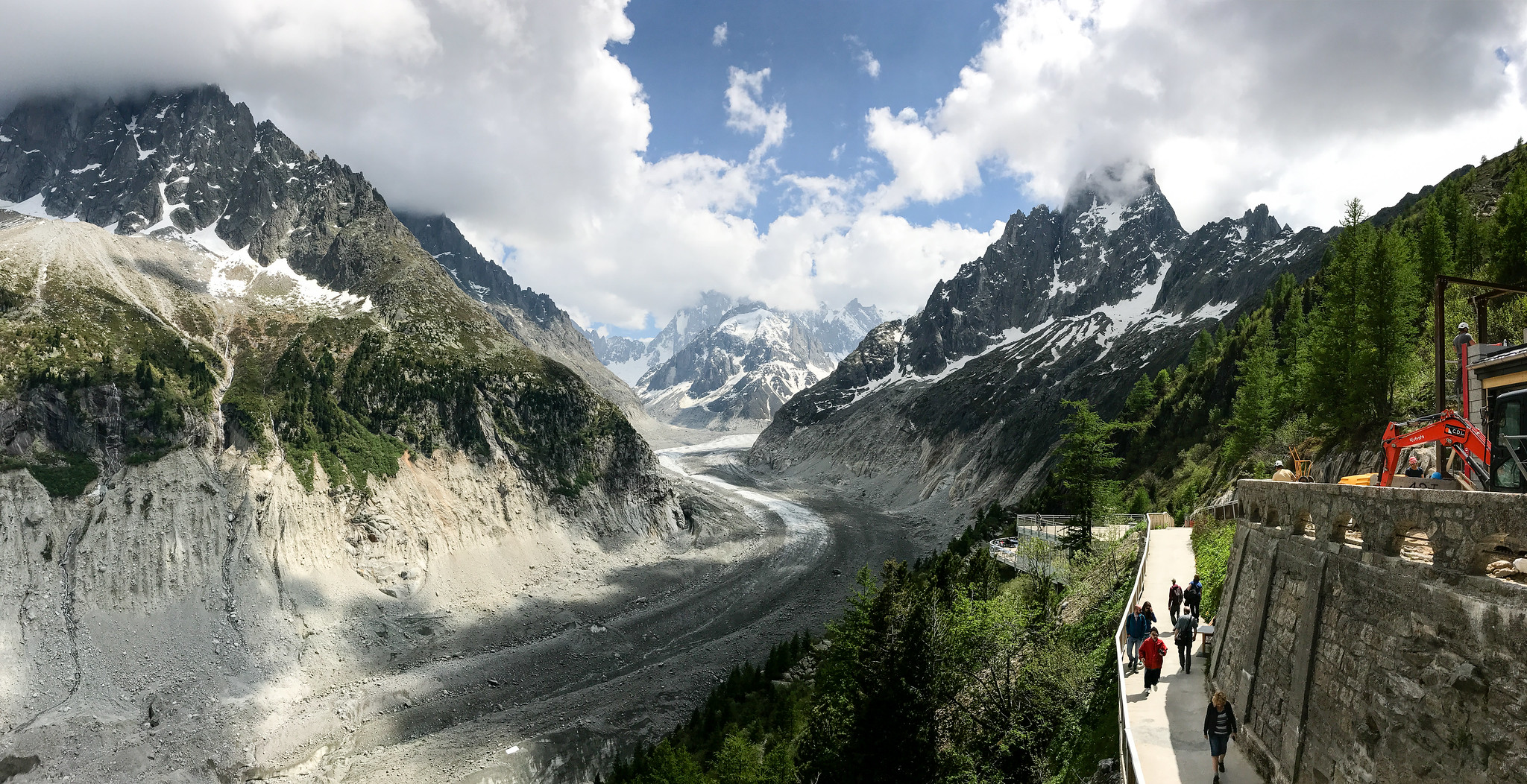 Kävimme perheen kanssa vuonna 2017 retkellä Chamonix´ssa, jossa sijaitsee Euroopan korkein huippu, Mont Blanc. Maisemat ovat hurjan kauniita, mutta reissuilta jäi mieleen erityisesti Euroopan toiseksi suurin jäätikkö, Mer de Glace eli Jäämeri. Jäätikkö on vaikuttava, kahdessa mielessä. Hieno, valtava luonnonmuodostelma ja todistus ilmastonmuutoksesta. Henki kurkussa (paljon portaita), mutta myös pala kurkussa vierailtiin keskikesän helteissä katsomassa pienenevää jäämassaa. En viitsinyt edes ottaa kuvia, jotenkin suretti niin kovasti.